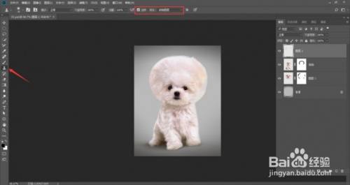 选择仿制钤记东西,设置柔角画笔为30像素,勾选“对齐”选项,可以持续对像素进行取样,在“样本”下拉列表中选择“所有图层”,单击图层面板底部的建立新图层按钮,建立一个图层,按住Alt键单击进行取样,然后铺开Alt键在狗狗头部边缘涂抹: