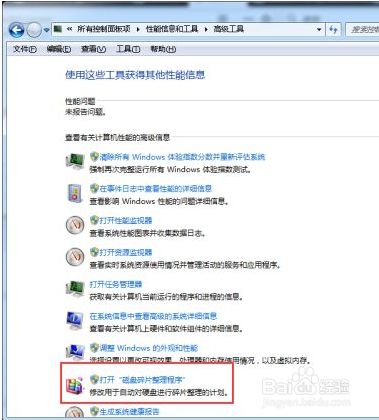 如图所示:在高级东西页面的下方找到“打开磁盘碎片清算程序”并点击。