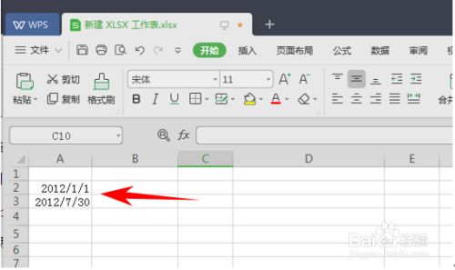 在新建的表格中,A2、A3单位格内输入示例日期“2012/1/1”、“2012/7/30”。