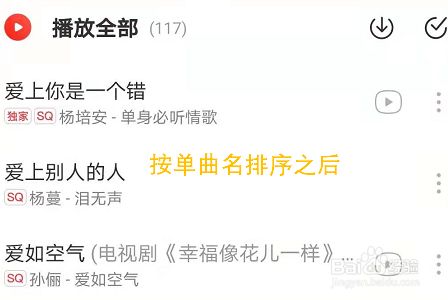 点击今后即可从头给这些歌曲进行排序,可以由默认排序更改为“按单曲名”或者是“按歌手名”等;