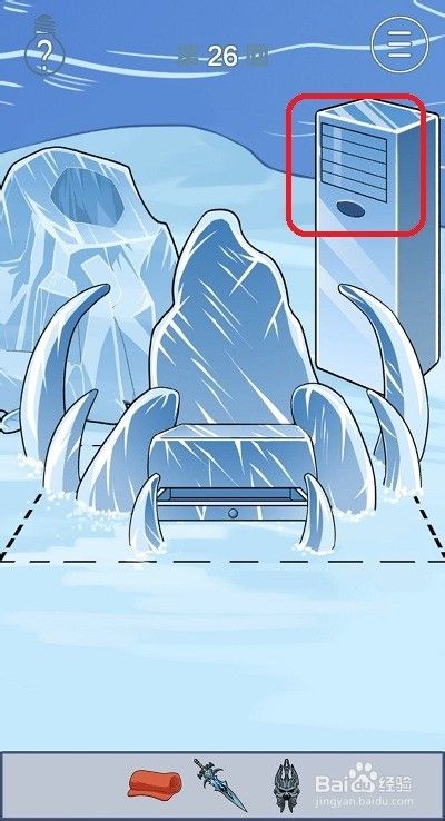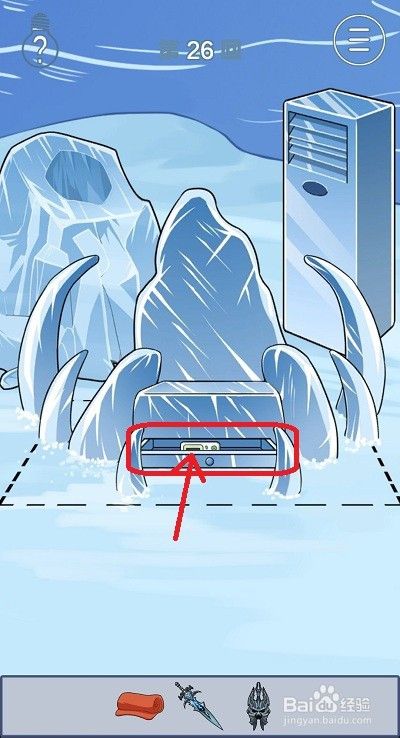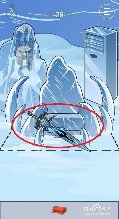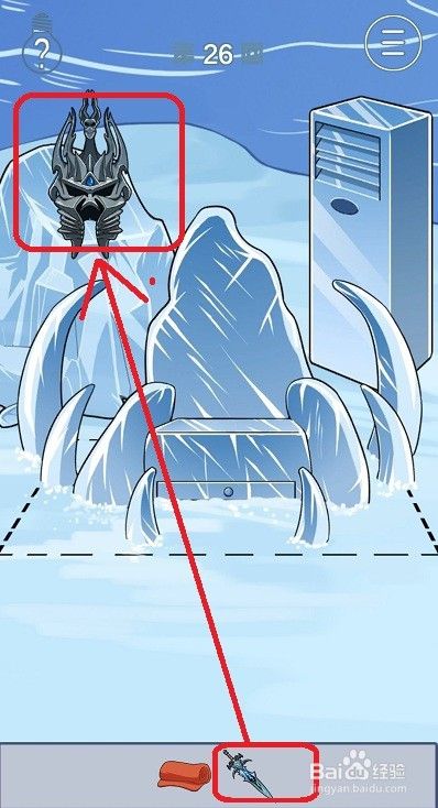 拖动道具栏中的宝剑到图示位置,就可以将冰封住的盔甲解除冰冻。