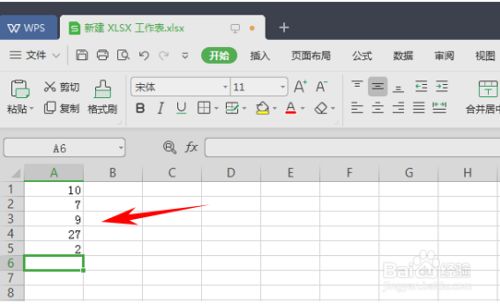 新建完当作后,我们在A1至A5单位格内别离输入数字“10、7、9、27、2”。