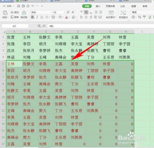 然后单击单位格填充框,标的目的下拉动单位格,松开后我们发现数据便如下图所示了。细心查看便可以发现,A列的人名即是上面四列的所有人名。