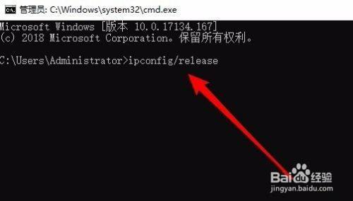 在打开的号令提醒符窗口中,我们输入号令Ipconfig/release,然后按下回车键。