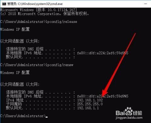 我们怎么样来改换新的IP地址呢?只需要在号令提醒符窗口中输入ipconfig / renew。