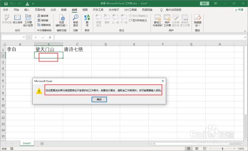 返回到Excel,点击选中单位格,输入文字内容,弹出提醒“表格处于庇护状况中无法输入内容”。