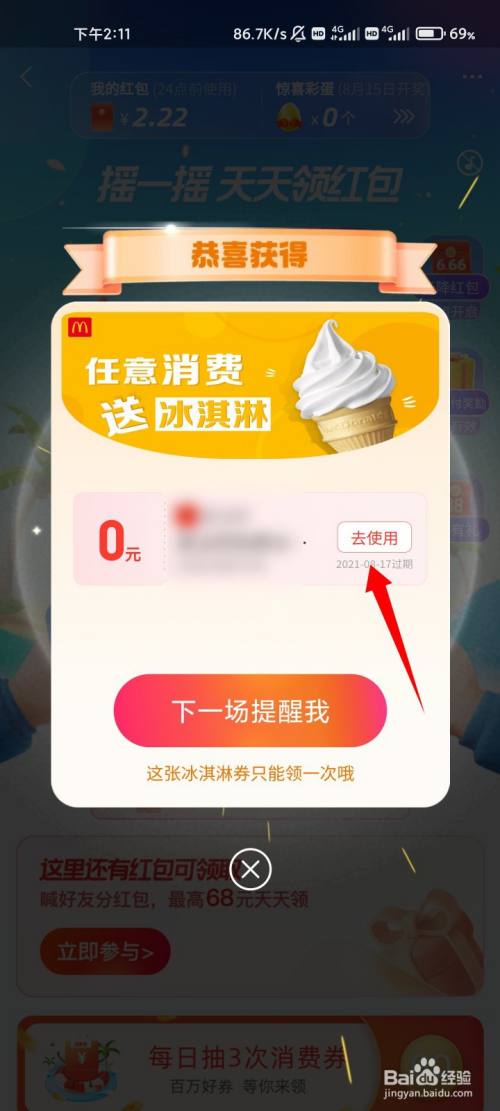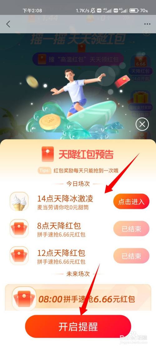 天天下战书2点可以抢到免费冰淇淋券,其余的时候可以抢到红包,点击底部的开启提醒按钮即可设置按时。