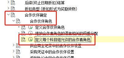 点击'物料办理',睁开子项,选择'采购' —>'合作伙伴确定' —>'合作伙伴脚色' —>'界说每个科目组许可的合作者脚色' ,点击执行