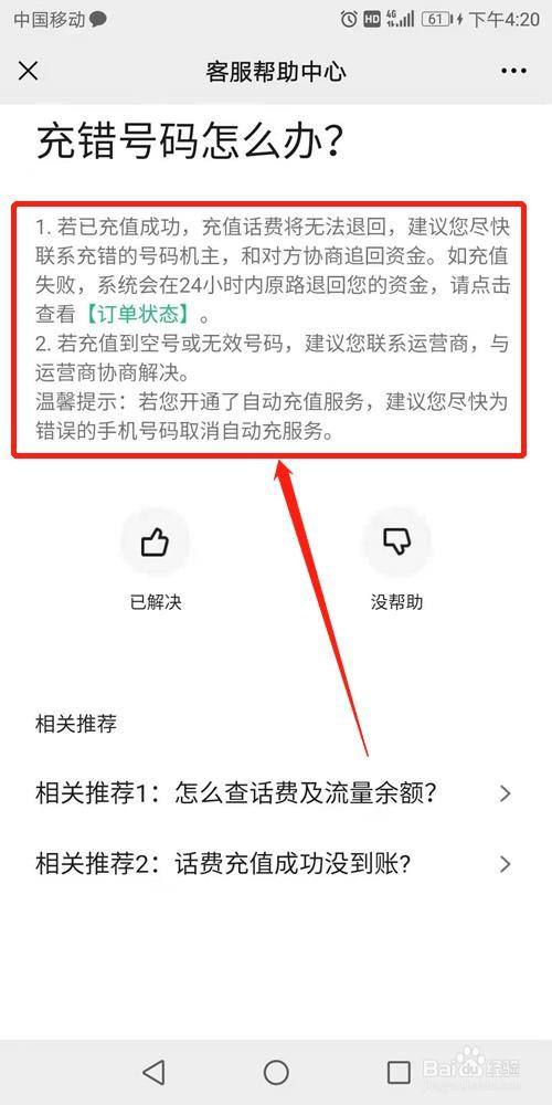 最后可以看到微信无法直接退回,但可以联系充错的号码机本家儿或运营商进行协商退回,如下图所示。