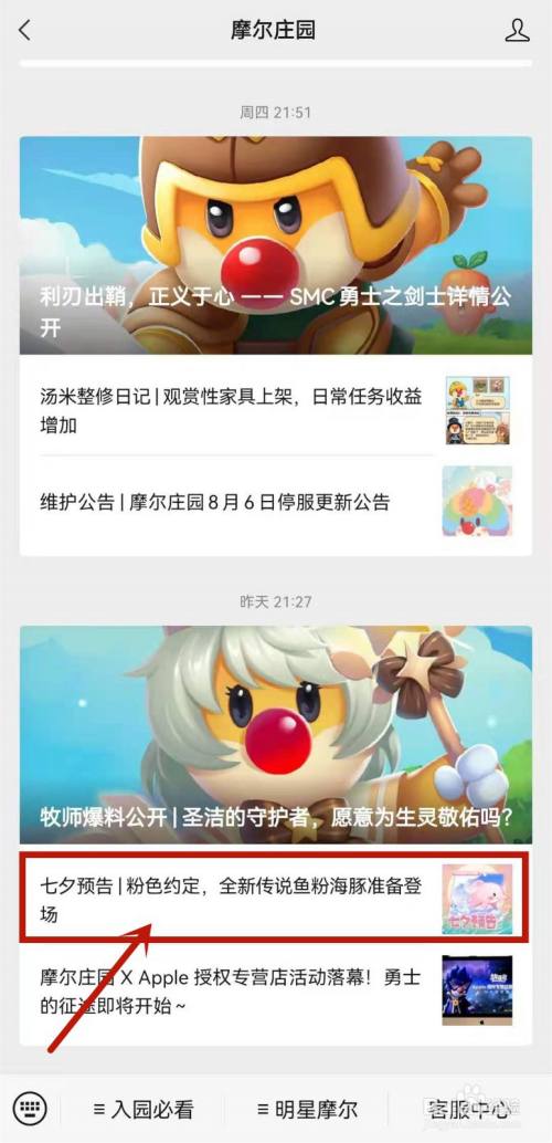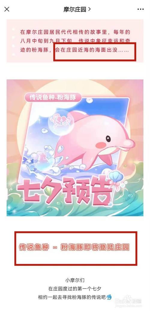 工具/原料华为荣耀20magic4.0.0微信8.0.9摩尔庄园手游方式/步骤1首先打开微信2点击进入摩尔庄园公家号3点击七夕预告粉色商定4最后即可查看七夕近海海面即可钓粉海豚END注重事项届时小编会实时快速更新粉海豚的位置但愿对您有所帮忙