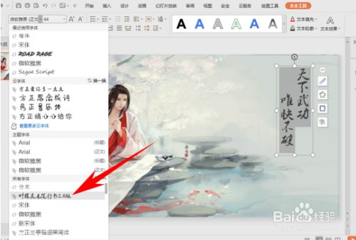 选中文字后,单击字体选择字体,这里我们选择毛笔行书2.0版。