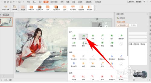 然后单击东西栏动画下的自界说动画,在添加结果下选择擦除。