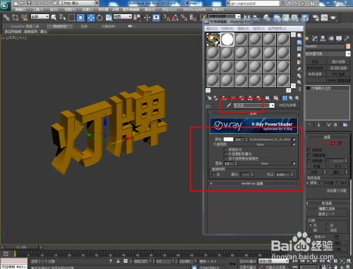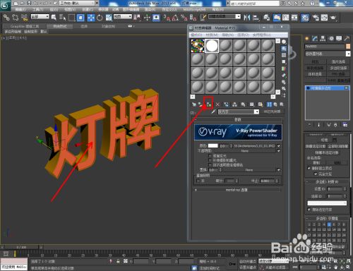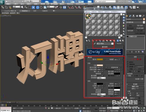 打开【材质编纂器】,按图示参数建立一个金属不锈钢材质球后,将材质球附加给灯牌字模子(如图所示)