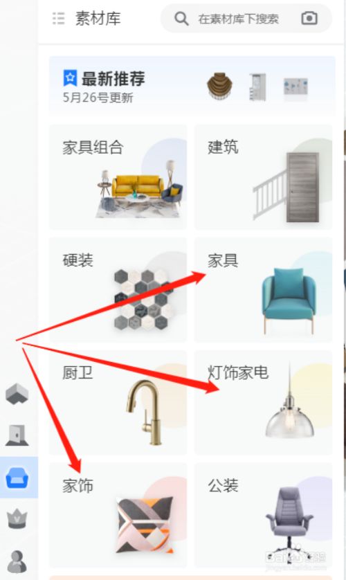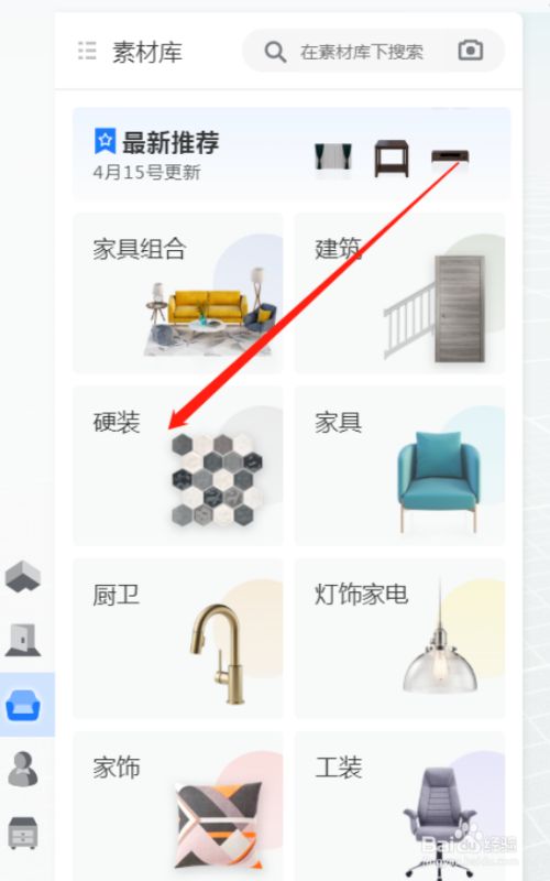可以直接在分类里找,也可以用下图搜刮本身想要材质的关头字;选中按鼠标左键放进相对应的墙面、地面位置就好了。