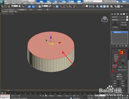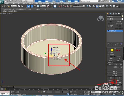 点击【多边形】图标,选中圆柱体顶面后,点击【插入】右边的小方框并设置好插入参数。完当作后,对插入面进行【挤出】处置;