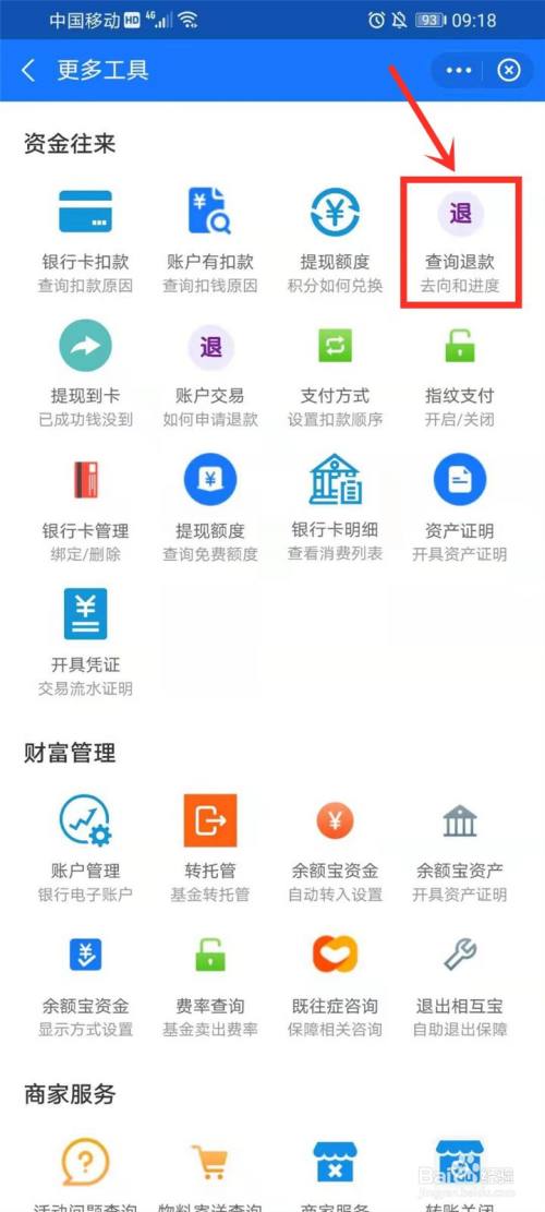 进入更多东西界面,点击【资金往来】下面的【查询退条目去标的目的和进度】。