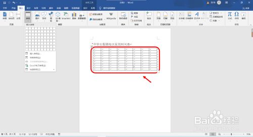 第二步,然后点击“插入”本家儿选项卡中的“表格”,插入一个8列9行的表格。如图所示: