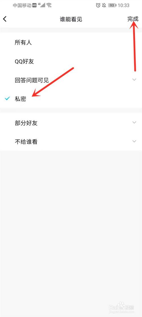 进入权限设置界面,选择【私密】,点击右上角【完当作】。