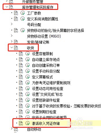 点击'物料办理',睁开子项,选择'库存办理和现实库存' —>'收货' —>'激活收入凭证存储' ,点击执行