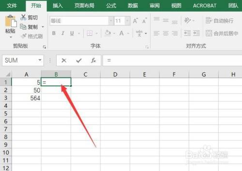 之后,选择B1单位格,输入”=“