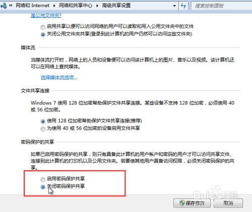 3、在高级共享设置的窗口中我们只需要设置“密码庇护的共享”选项下的“封闭密码庇护共享”即可,点击“保留点窜”,