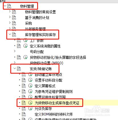 点击'物料办理',睁开子项,选择'库存办理和现实库存' —>'发货/转储记帐' —>'为货色移动生当作库存清点凭证' ,点击执行