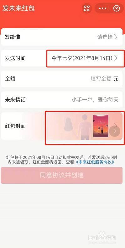 接着便进入了红包发送页面,按照选项添加相关信息,点击赞成和谈并建立。时候和红包封面可以更改,默认的是本年七夕。