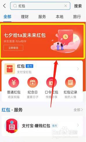 首先开启支付宝app,点击上方搜索框输入“红包”进入搜刮,页面如下,点击七夕给ta发将来红包进入。