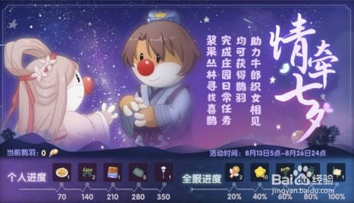 活动内容:小摩尔帮忙喜鹊获得【鹊羽】搭建银河桥,让牛郎织女相见。