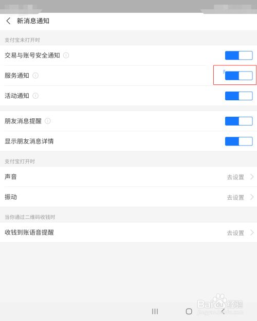 第五步,在新动静通知界面中,将【办事通知】后面的开关按钮开启即可,蓝色代表开启,如下图