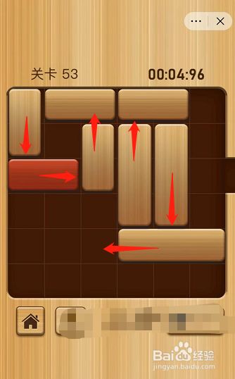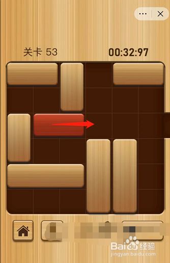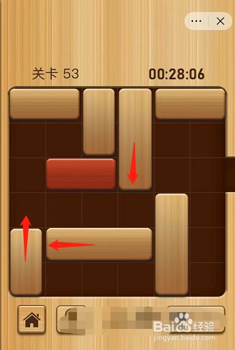 进入解锁红木第53关,首先将此中两个长木块移动到上方,然后将另一个长木块移动到右侧。