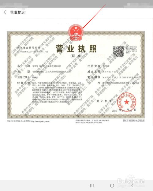 第六步,在营业执照界面中,即可查看到支付宝的营业执照,如下图