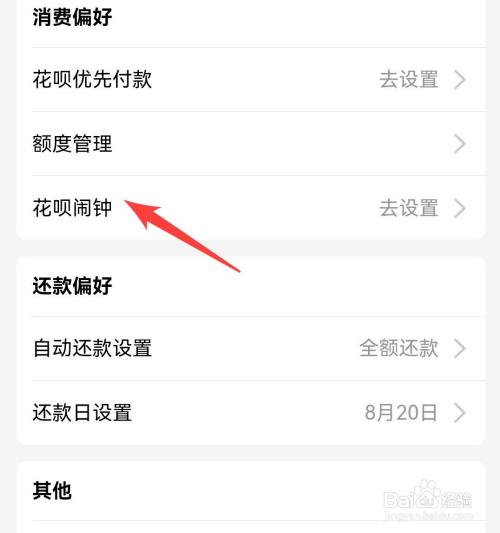点击“右上角设置”之后,点击“花呗闹钟按钮”。