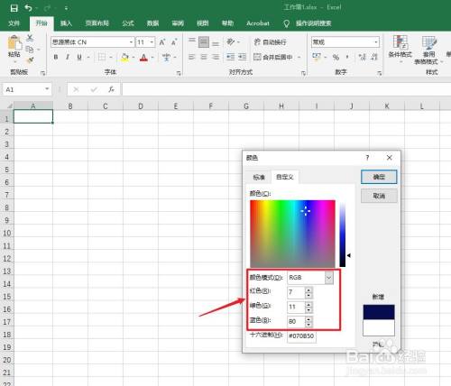 调整颜色模式为RGB,红色:7,绿色:11,蓝色:80。