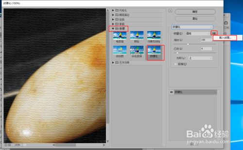 滤镜库对话框中点击“纹理”-“纹理化”,点击画布右侧按钮显示出“载入纹理”点击“载入纹理”。