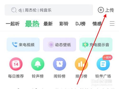 首先打开铃声多多app,点击右上角【上传】。