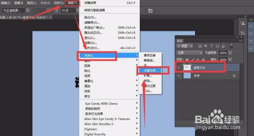 在滤镜菜单中,点击气概化选项,选择浮雕结果,对文字进行应用