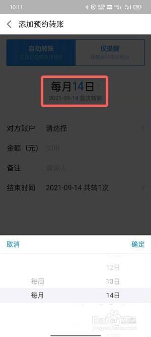 5、设置好需要转账的账户、金额、备注,最主要的是设置【竣事时候】,也就是需要转账的次数;
