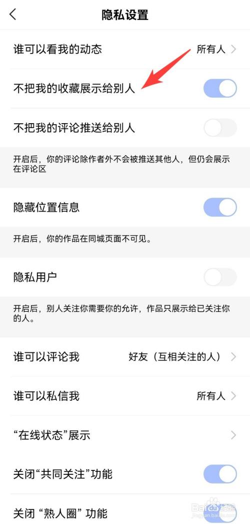 点击“隐私设置选项”之后,开启”不把我的保藏展示给别人按钮“。