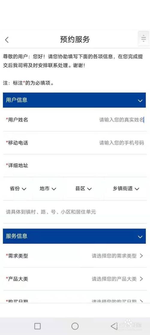 输入用户信息,具体地址,空调产物详情,预约日期,点击提交。