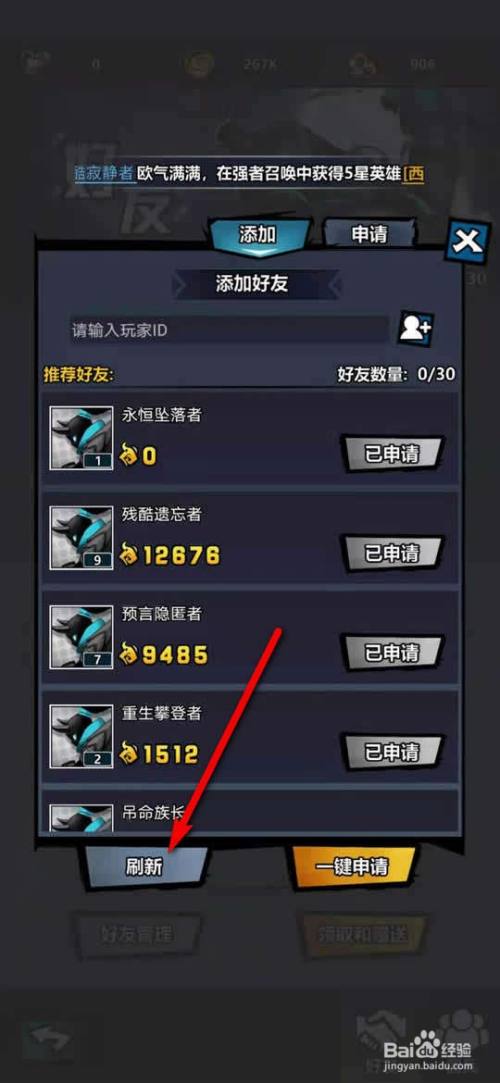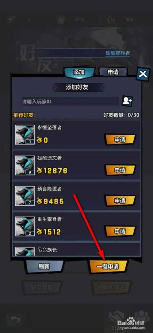工具/原料荣耀9xEMUI10.1.0.133火柴人醒觉1.2方式/步骤1在火柴人醒觉手游点击“老友”。2点击“老友办理”。3点选“申请”,点击“一键经由过程”老友申请即可。4点击“添加”。5点击“一键申请”期待对方玩家赞成申请即可。6点击“刷新”即可刷新保举老友。END