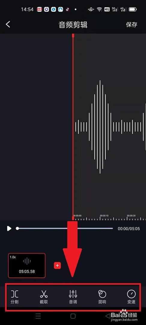 6、格局转换完当作就可以进行朋分、截取、调子、混响、变速等剪辑操作了,如图