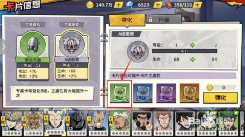 工具/原料iPhone7IOS14.4一拳超人最强之男1.4.3方式/步骤1首先,点击游戏首页底部的脚色按钮2选择脚色3点击右侧的装备卡片4在专属卡页面点击专属徽章5点击强化按钮6选择强化的经验7点击强化按钮8完当作操作,专属徽章被强化,总战力晋升END注重事项
