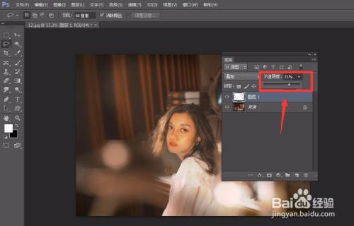 下面,我们还可以按照现实需要调整图层的【不透明度】,来完美光照结果,使之加倍天然。若是感觉光照结果还不太够,我们也可以再复制一层光效层。