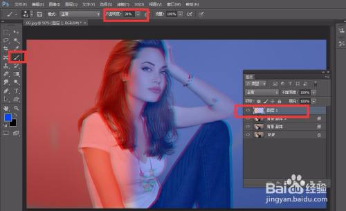 最后,我们选择东西栏中的画笔东西,设置画笔硬度为0,流量为40%摆布,新建一个图层,在图层左侧涂上红色,右侧涂上蓝色,如下图所示。