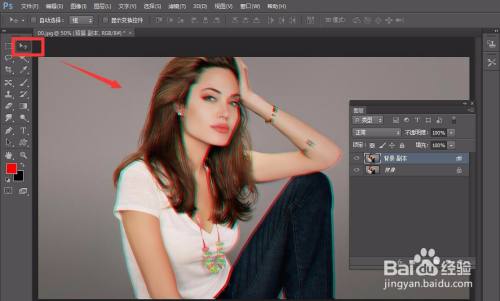 我们选择左侧菜单栏的移动东西,按键盘上的上下摆布键,将复制的图层微调位置。