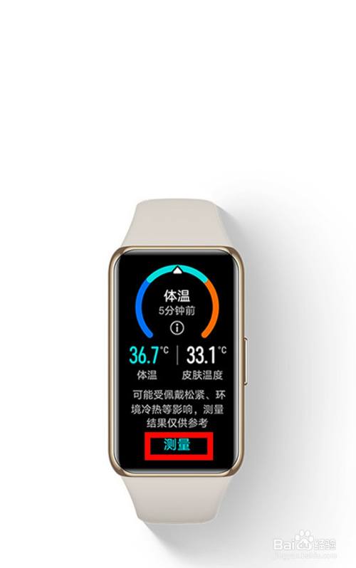 进入“体温”界面——点击【测量】按键,即可当即测量体温。检测完毕,手环会显示当前的体暖和皮肤温度。