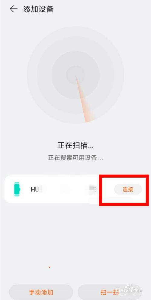 对搜刮出的“手环设备”进行【毗连】——进入“毗连设备”界面,按照页面提醒,操作“手环”进行配对——配对当作功。