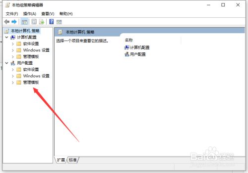 待组策略编纂器弹出后,依次拔取“用户设置装备摆设”、“办理模板”;