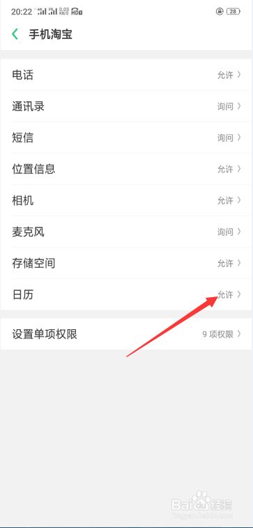 进入其设置界面,如下图,我们可以发现其为扣问,此时我们点击许可,如下图,之后,就会酿成这样,如下图,此时,返回,您就会发现日历已经变动为许可,如下图,这样手机淘宝对日历的权限就设置完当作了,其他的权限按照此方式完当作